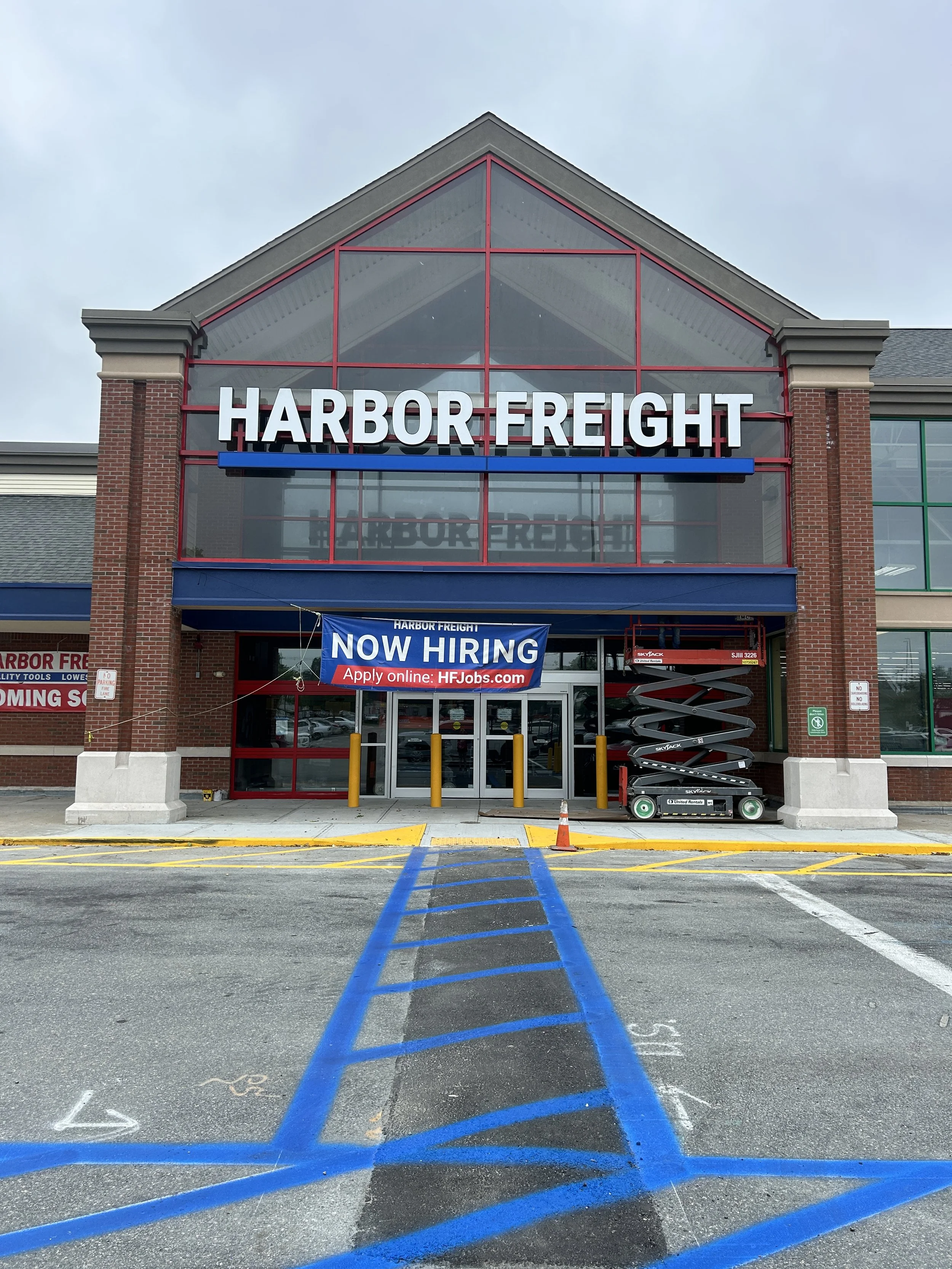 Channel letters illuminated with LED installed at Harbor Freight in Fairhaven, MA